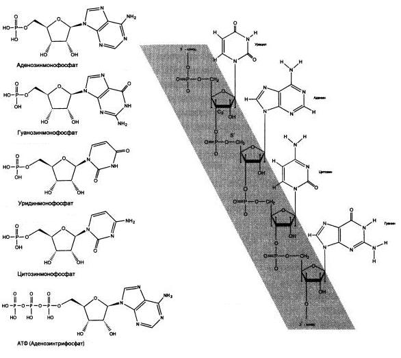 Четыре составных блока молекулы РНК — нуклеотиды аденозин (аденин + рибоза), гуанозин (гуанин + рибоза), уридин (урацил + рибоза) и цитидин (цитозин + рибоза), к каждому из которых присоединено по одному остатку фосфорной кислоты. АТФ (главная энергетическая молекула живой клетки) представляет собой аденозин с тремя фосфатами.