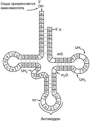 Схема транспортной РНК. A, G, C, U — стандартные нуклеотиды аденозин, гуанозин, цитидин и уридин, другими буквами отмечены нестандартные (модифицированные) нуклеотиды, в том числе I — инозин. Как и многие другие молекулы РНК, тРНК образует петли за счет того, что рибонуклеотиды попарно «склеиваются» друг с другом по принципу комплементарности. Как можно видеть на рисунке, C (цитозин) обычно склеивается с G (гуанином), а A (аденин) — с U (урацилом). Но в биологии, как мы уже знаем, нет правил без исключений: в двух местах этой молекулы, вопреки принципу комплементарности, G соединяется с U.