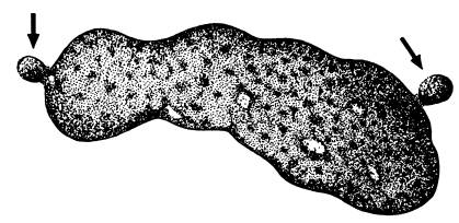 Ферроплазма в процессе почкования (почки показаны стрелками). По фотографии из статьи с первоописанием микроба (O. V. Golyshina et.al., 2000).