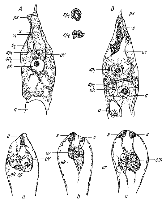 Таким образом, в одном и том же зародышевом мешке одновременно совершаются два акта оплодотворения. В результате первого образуется зародыш будущего растения, а в результате второго — питательная ткань — эндосперм.