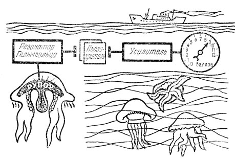 Как же такое простое животное, как медуза, узнает за много часов о приближении шторма? Оказывается, у медузы имеется инфраухо, оно позволяет ей улавливать недоступные слуху человека инфразвуковые колебания (частотой 8 — 13 гц), которые хорошо распространяются в воде и появляются на 10 — 15 час раньше шторма. Инфраухо медузы — это стебелек, оканчивающийся слуховой колбой — шаром с жидкостью, в которой плавают камешки, соприкасающиеся с нервным окончаниями. Первой воспринимает инфразвуковые колебания слуховая колба, наполненная жидкостью, затем эти колебания через камешки в пузырьке передаются нервам. Используя принцип действия "уха" медузы, сотрудники кафедры биофизики Московского государственного университета им. М. В. Ломоносова создали электронный аппарат — автоматический предсказатель бурь.