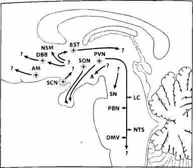 (А — amygdala; AM — anteromedial subnucleus of the basal nucleus; BST — bed nucleus of the stria terminals; DBB — diagonal band of Broca; DMV — dorsal motor nucleus of the nervus vagus; LC — locus coeruleus; NSM — nucleus septalis medialis; NTS — nucleus of the solitary tract; PBN — parabrachial nucleus; PVN — paraventricular nucleus; SON — supraoptic nucleus; SCN — suprachiasmatic nucleus; SN — substantia nigra)
