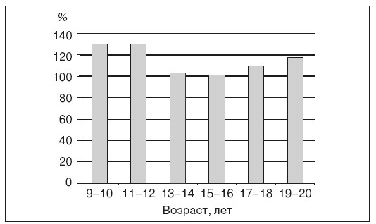 Рис. 60. Возрастная динамика физической работоспособности юных футболистов по отношению к работоспособности нетренированных сверстников, принятой за 100 %