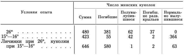 Следующие цифры из работы Керкиса (Kerkis, 1933) наглядно иллюстрируют это решающее влияние разницы в 10°: при 16° вылупилось 86 % вполне нормальных гибридов, а при 26°—0 %. Вредное влияние 26° сказывается уже при действии на личинок, и хотя развитие личинок идет и благоприятно, по вылупление из куколок, даже перенесенных в комнатную температуру, идет очень плохо и лишь у 10 % куколок. Не менее интересно далее, что развитие мужских куколок, получающихся при скрещивании sim. ? ? ? mel. построения XXY, идет одинаково хорошо при обеих температурах. Следует впрочем иметь в виду, что хотя здесь и говорится о влиянии температуры на развитие, но неизвестно, влияет ли температура здесь непосредственно на эмбриогенез или изменяет другие экологические условия — понижает кислотность среды и т. д.