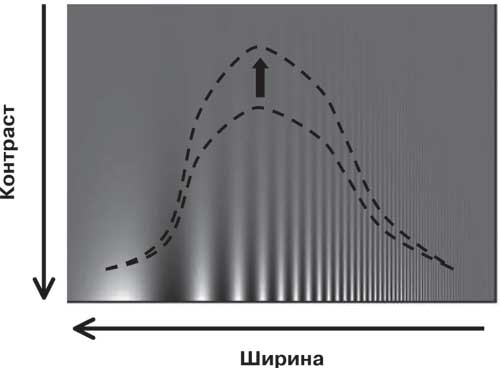 Рис. 10. Обычно мы зрительно воспринимаем формы с большой степенью контрастности (внизу, под пунктирными линиями). У опытных геймеров этот лимит гораздо выше (над пунктирными линиями), что свидетельствует об усилении восприятия форм со слабым контрастом