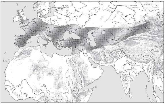Рис. 29. Приблизительные границы минимальной области распространения неандертальцев в середине позднего плейстоцена (около 50 тыс. лет назад).