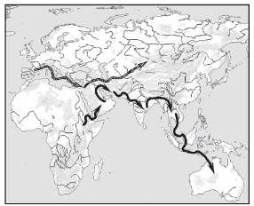 Рис. 30. Основные направления расселения неандертальцев (серые стрелки) и гомо сапиенс (черные стрелки) в середине позднего плейстоцена (примерно 70-45 тыс. лет назад).