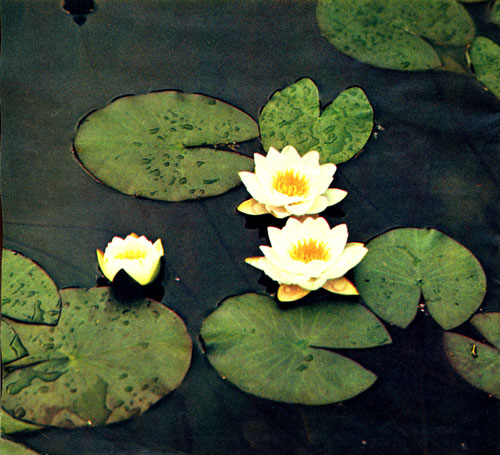 Среди больших, круглых, как блюдца, листьев, покоятся на воде белые кувшинки — водяные лилии. Кувшинки так любят солнце, что весь день «не сводят с него глаз». Утром солнце на востоке — и лилии смотрят на восток. В полдень оно на юге — и лилии, все как одна, поворачивают головки на юг. Закроет солнце тучка — сомкнут лилии лепестки, загрустят. А сядет солнышко, уйдёт за горизонт — и кувшинок как не бывало. На воде одни зелёные блюдца. Куда же делись цветы? В воду спрятались. Так и будут спать под водой, пока солнце не выглянет.