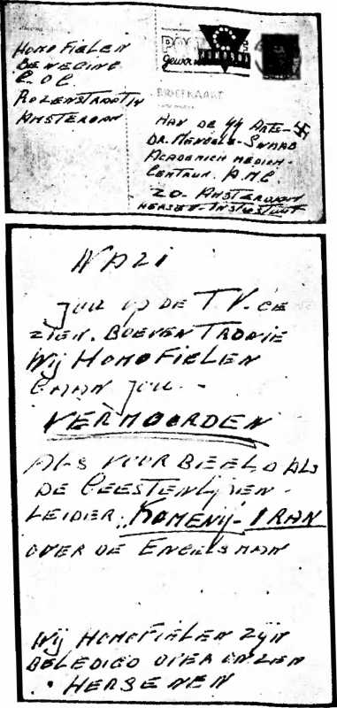 На сообщение о первом найденном нами различии в мозге гомо- и гетеросексуальных мужчин (позднее опубликовано: Swaab and Hofman, Brain Res. 537, 141–148, 1990, см. IV.3) последовала резко неодобрительная реакция со стороны феминисток. Всё это началось с декабрьского выпуска Akademie Nieuws за 1988 год, журнала, который почти никто не читает. Исследователям институтов Королевской Нидерландской академии наук (KNAWj был задан вопрос, чем именно они занимаются. Я рассказал о некоторых деталях наших исследований мозга в отношении сексуальной и гендерной ориентации Тему подхватил Ханс ван Маанен, опытный журналист из газеты Het Parool. Он написал две статьи: Hersenen bij homo's anders[27] и Неt brein achter de homoseksuahteit[28], в которых не было никаких ошибок. Статьи вызвали такую бурю негодования, которую я и представить себе не мог. Из-за чего возник весь этот поток раздраженных эмоций и совершенно не туда обращенного негодования, мне и до сих пор не очень понятно. Табу на биологический фон сексуальной ориентации, столь решительное в тот период, разумеется, играло определенную роль Группа гомосексуальных мужчин чуть не с религиозным пафосом объявила, что вообще все мужчины гомосексуальны, но только часть из них решается сделать свой выбор. Они назвали этот выбор политическим. Я ответил, что не могу усмотреть здесь никакого политического выбора и что выбор относительно нашей сексуальной ориентации делается во время пребывания в матке. Как бы то ни было, немалая часть их разозлилась до крайности, и в течение трех недель в прессе появились сотни статей. Нидерландскую ассоциацию за интеграцию гомосексуальности (СОС) «потрясло это исследование». Профессор д-р Роб Тилман был одним из самых яростных моих оппонентов. Он демонизировал мои исследования, называя их «крайне бестактными», и утверждал, что для проведения подобных исследований и последующих публикаций я должен был заручиться его согласием, что было полной нелепостью. Позднее в одном из интервью он пошел на попятный и заявил: «В исследованиях гомосексуальности я стою ближе всего к Сваабу» и: «Я принадлежу к тем, кто склонен относиться самым серьезным обоазом к биологическим компонентам». Между тем и главный редактор Cay Krant Хенк Крол вставил свое словцо: «Такого рода исследования укрепляют представление о том, что гомосексуальность — это болезнь. Это даст новый толчок дискриминации гомосексуалов». По поводу моих исследований членом партии радикалов (PPR) Петером Ланкхорстом был сделан запрос в парламенте. Через министра и президента KNAW в мой офис были направлены вопросы, и тем же путем я направил свои ответы. Дома день и ночь я испытывал настоящий телефонный террор и однажды даже получил такую открытку: «Врачу-эсэсовцу д-ру Менгеле-Сваабу. Наци. Видел тебя по ТВ. Твою харю. Мы гомофилы тебя прикончим. Для примера. Типа как духовный вождь Комейни — Иран англичанина. Мы гомофилы оскорблены за наших мозгов» (рис. 11). Я не принял это слишком всерьез и решил, что если они так же хорошо приканчивают, как пишут по-нидерландски, то опасность невелика. Сейчас я посмотрел бы на это иначе. Я получил также открытку со словами: «Ты, должно быть, очень жалеешь, что не смог поработать в Аушвице у доктора Менгеле» (рис. 12). Комиссии корпели над моими исследованиями, а на одной лекции в амстердамском Академическом медицинском центре (АМС) мне, без всякой просьбы с мо