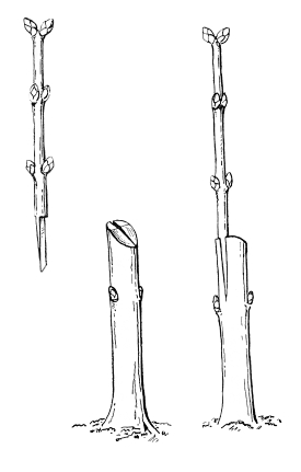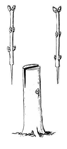 Подвой очищают от нижерасположенных боковых разветвлений и спиливают на нужном уровне садовой пилой. Поверхность среза выравнивают и зачищают ножом. В зависимости от количества прививаемых черенков подвой разрезают в вертикальном направлении по диаметру или радиусу. В последнем случае прививают в полурасщеп, и поверхности разреза делаются сходящимися. При полном расщепе поверхности срезов делают параллельными. В отдельных случаях проводят два продольных перпендикулярных надреза. В этом случае подвой расщепляют на четыре части. Глубина продольных надрезов зависит от размера среза черенков На черенке с обеих сторон делают два боковых косых среза. Лезвие ножа располагают под углом 30° к оси черенка. Если черенок небольших размеров, то не делают боковых заплечиков и черенок располагают в расщепе так, чтобы с плоскостью срезов совпадала верхняя точка срезов черенка.