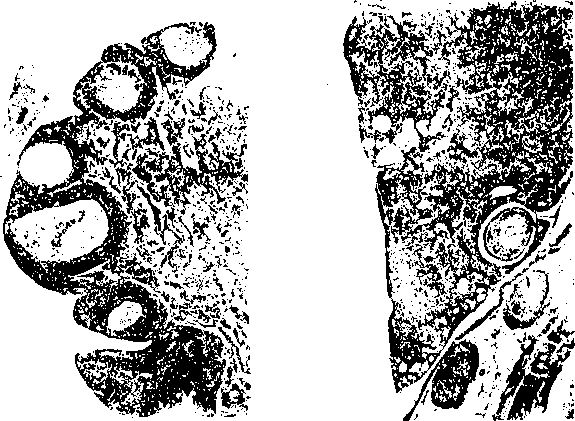 Рис. 61. Разрез через яичник в брачный период гибрида каролинки и свиязи (по Полю).