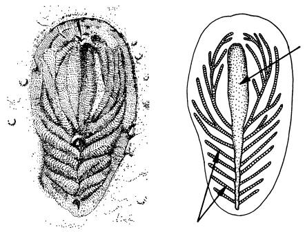 Еще одно животное со «сдвинутой» метаметрией — дикинсония. Справа — ее пищеварительная система. По изображению из книги Я. Е. Малаховской и А. Ю. Иванцовой Вендские жители Земли. http://evolbiol.ru/vend.htm.