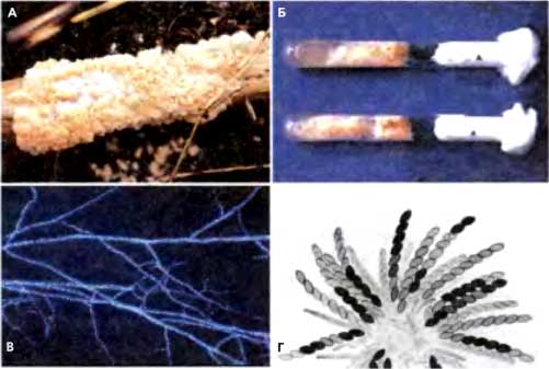 (Б) Агаровые «косяки» с вегетативными культурами N. crassa в лаборатории (фото N.B.Raju, Stanford University)