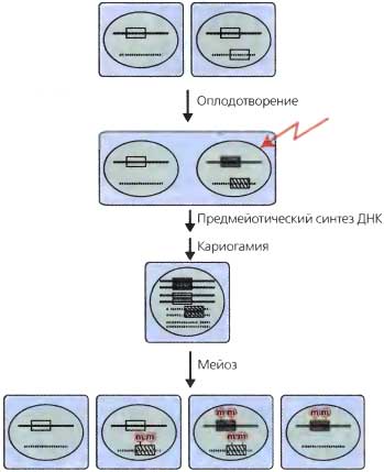 Для упрощения показаны лишь две хромосомы. Пустой прямоугольник представляет ген или любой хромосомный сегмент, который во время дупликации (например, в штамме, показанном наверху справа) подвержен R1P (символизируется знаком молнии) между оплодотворением и кариогамией. Результаты генетических экспериментов показывают, что дупликации могут повторно подвергаться залпам транзиций С в Т (символизируются заполненными прямоугольниками) на протяжении этого периода времени, равного -10 митозам, как раз к конечному премейотическому синтезу ДНК [right up to the final premeiotic DNA synthesis] (Selker et al., 1987; Watters et al., 1999). Показаны четыре возможные комбинации хромосом в потомстве, и красное «т» изображает метилирование ДНК, которое часто (хотя и не всегда) связано с продуктами RIP