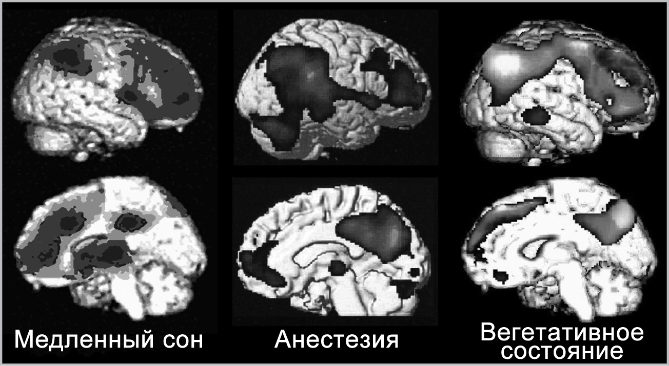 Рисунок 32. Бессознательному состоянию, сопряженному с медленным сном, анестезией или вегетативным состоянием, соответствует снижение скорости обмена веществ во фронтальной и теменной коре. Активность может снижаться и в других областях, однако именно в областях, составляющих глобальное нейронное рабочее пространство, потребление энергии при потере сознания резко падает, причем опыт можно воспроизвести