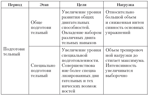 В подготовительном периоде закладывается функциональная основа для успешной подготовки и участия в основных соревнованиях, создаются и совершенствуются предпосылки для формирования спортивной формы, обеспечивается становление различных сторон подготовленности спортсменов. В этом периоде выделяют общеподготовительный и специально-подготовительный этапы.