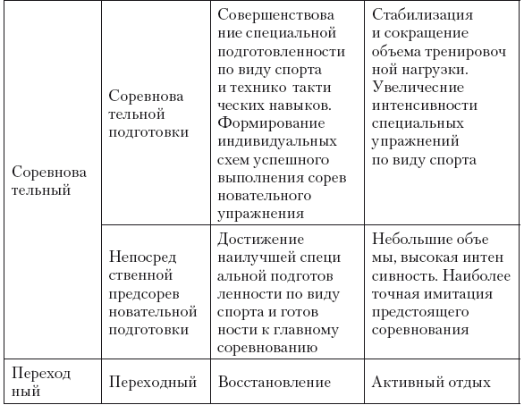 В макроциклах различают такие периоды подготовки, как подготовительный, соревновательный и переходный (табл. 10.1). Работа, выполненная за одно тренировочное занятие, тренировочный день, неделю, месяц, год и олимпийский цикл в целом, измеряется в единицах тренировочной нагрузки.