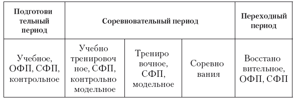 Ю.К. Гавердовский и В.М. Смолевский (2014) в системе круглогодичной подготовки гимнастов, помимо вышеперечисленных, выделяют занятия: по общей физической подготовке (ОФП), специальной физической подготовке (СФП) и разминочные (как вспомогательная организационно-методическая форма, не решающая задачи обучения или тренировки, но необходимая в качестве средства настройки функциональных систем, психики спортсмена на предстоящую более серьезную работу). Владея различными формами занятий, тренер может гибко строить процесс подготовки. Каждый из видов занятий играет при этом роль «строительного модуля», позволяющего планировать циклический процесс разной направленности (табл. 10.2).