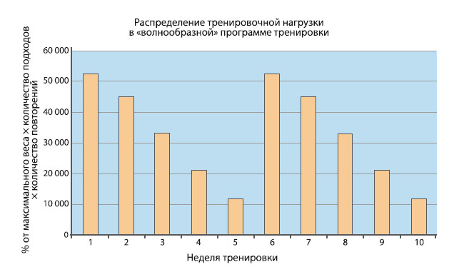 Пример 10-недельной силовой подготовки в рамках волнообразной модели периодизации приведен в работе S. Bartolomei с соавторами (2015). Волнообразная программа тренировки состояла из двух пяти-недельных мезоциклов. В течение каждого из них тренировочная нагрузка плавно изменялась с высокообъемной низкоинтенсивной на низкообъемную высокоинтенсивную. Первая неделя каждого микроцикла была нацелена на развитие мышечной гипертрофии. В течение второй недели тренировки общий тренировочный объем был незначительно уменьшен. Третья и четвертая недели каждого мезоцикла были нацелены на развитие максимальной силы, и участники выполняли небольшое количество повторений с большими отягощениями. Последняя неделя каждого мезоцикла для обеих групп была посвящена восстановлению и включала лишь 3 легкие тренировки, состоящие из 3 подходов по 6 повторений весом 65 % от максимума. На рисунке 10.1 показано волнообразное распределение рабочей нагрузки, характеризующее описанную модель периодизации.