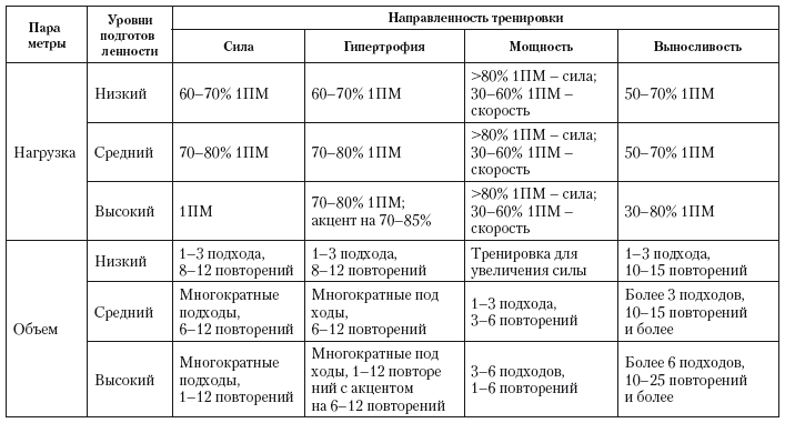 Вне зависимости от моделей той или иной используемой периодизации существуют общие рекомендации по структуре тренировочных программ для развития силы, гипертрофии, мощности и локальной мышечной выносливости (табл. 10.5). Рекомендации, описанные в таблице, предложены Американским колледжем спортивной медицины для развития силовых возможностей взрослых людей с разным первоначальным уровнем силовой подготовленности. Они также включают различные типы мышечного сокращения (изометрические, концентрические, эксцентрические), односуставные или многосуставные упражнения, порядок и последовательность упражнений, интервалы отдыха.