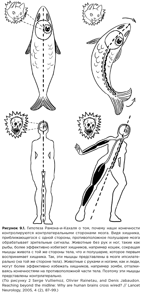 Очевидно, лучший ход действий в такой момент – отпрыгнуть от зомби вправо. И Рамон-и-Кахаль предположил, что, будь вы рыбой, самый быстрый способ убраться от хищника – сократить мышцы правой стороны тела. Это бы увело ваше тело прочь от угрозы, и вы бы начали плыть в противоположном направлении (вправо). Но вы не рыба. Вы человек и сейчас подвергаетесь атаке зомби слева. Так как вы согнуты, это значит, что вам надо оттолкнуться, используя левые руку и ногу, чтобы отодвинуться от зомби. Теперь рассмотрим две версии вас с разной «прошивкой» мозга. В ипсилатеральной версии вас моторная кора в правом полушарии контролирует правые руку и ногу («ипси» на латыни значит «тот же»). В контрлатеральной версии вы имеете нормальную перекрестную организацию, когда левая моторная кора контролирует правые руку и ногу.