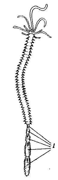 «Вегетативное» размножение многощетинкового червя аутолитус: 1 — сегменты заднего конца тела, отделяющиеся от материнской особи