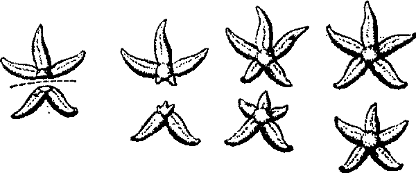 Однако кольчатые черви, морские звезды — отнюдь не самые примитивные животные — нередко размножаются таким способом. У многих видов червей отшнуровываются части тела, становясь самостоятельными организмами, а кусочки разрубленных морских звезд вырастают в новые звездочки. Одно время таким способом — разрубанием на куски — пытались бороться с вредителем коралловых рифов — звездой акантастер, или терновый венец. Ничего хорошего из этой затеи не вышло: вместо уничтожения вредителей люди из лучших побуждений занимались их размножением.