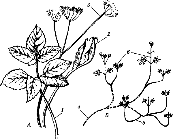 Сныть обыкновенная: А — общий вид; Б — схема строения клона 1 — развернувшийся лист; 2 — молодой лист; 3 — соцветие; 4 — отмершие участки корневища; 5 — живое корневище; 6 — надземные побеги