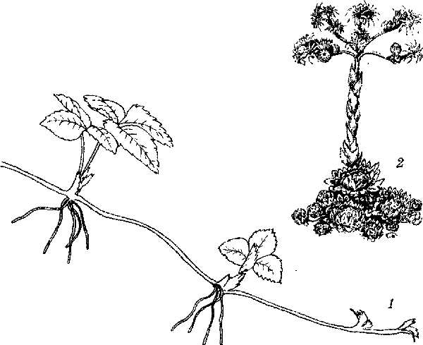 Различные способы вегетативного размножения: 1 — усами у земляники; 2 — боковыми розетками у молодила