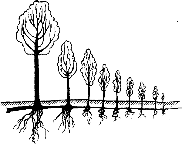 Вегетативное размножение имеет огромное значение для растений. Проходя вдоль лесной опушки, обратите как — нибудь внимание на растущую на краю леса осину. Нередко можно видеть следующую картину: на довольно большом расстоянии (5–10 метров и более) от края леса стоит взрослое — толстое и высокое дерево. Ближе к краю несколько осин помоложе, перед ними — множество тонких стволиков высотой 2–3 метра, а на поле или на лугу — густая поросль совсем тоненьких побегов осины, некоторые из которых появились только в этом году. Если раскопать землю в этой рощице, мы увидим, что все стволики осины растут от общей корневой системы, развитой самым старым стволом. Побеги, выросшие из придаточных почек на корнях, называются корневыми отпрысками. Размножение с помощью корневых отпрысков — очень характерное и, пожалуй, самое замечательное свойство осины. За счет вегетативного размножения осина захватывает новые территории, увеличивая площадь, занятую лесом. Без корневых отпрысков осина не смогла бы так интенсивно захватить края полей, лугов или пустырей — слабые проростки, развивающиеся из мелких семян осины, не смогут пробиться через густую дернину трав.
