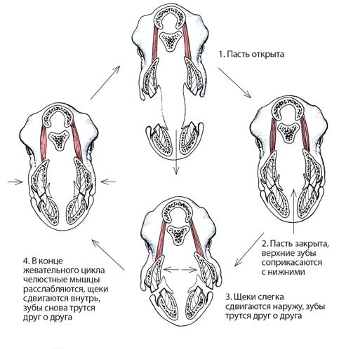 Согласно исследованиям Дэвида Нормана и модели плеврокинеза Дэвида Вейшампела, орнитоподы, например эдмонтозавр, обладали уникальным способом трения верхних зубов о нижние. На схеме показана последовательность движений челюстей, голова животного изображена в поперечном сечении