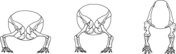 Эксперты выдвигали разные идеи о том, как были устроены скапулокоракоиды и передние конечности четвероногих птицетазовых. Две крайние – что они либо были полностью расставлены, либо полностью выпрямлены, как показано на схемах. Истина, скорее всего, где-то посередине