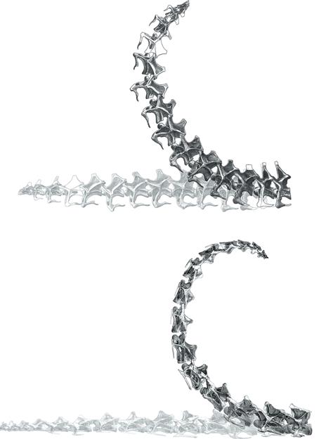 Если учесть хрящевые диски между шейными позвонками завроподовых динозавров, то окажется, что шея была очень гибкой и ее можно было сильно сгибать вверх (и вниз). Наверху показана шея апатозавра, внизу – диплодока