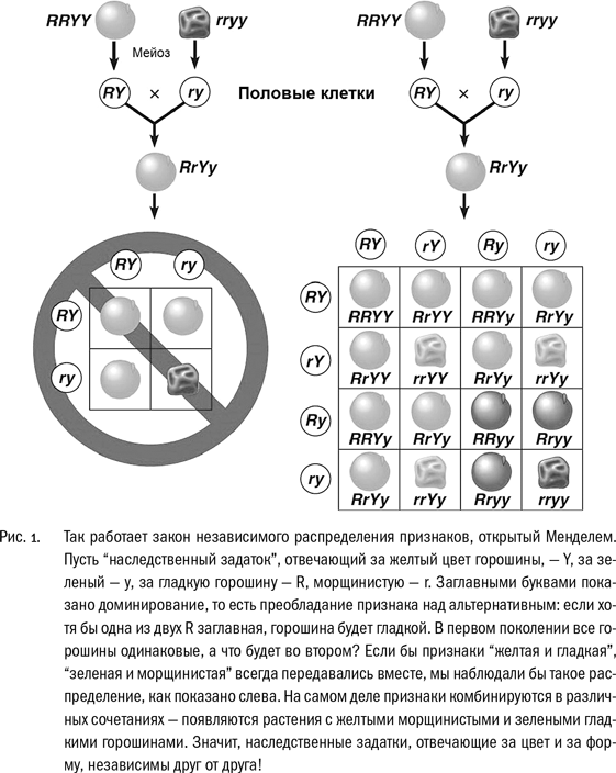По-видимому, первые научные соображения о наследственности, сохранившие значимость до наших дней, высказал в XIX в. Грегор Мендель – монах, а затем аббат августинского монастыря святого Фомы в Брюнне (сейчас Брно). С 1854 г. в течение восьми лет Мендель проводил опыты по скрещиванию гороха. Ему повезло с объектом исследований: горох быстро растет, у него легко выбрать признаки, представленные не множеством вариаций (как, например, цвет глаз у человека), а всего двумя. Так, горошины могут быть желтыми или зелеными, гладкими или морщинистыми.