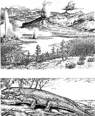 РИСУНОК 29. (а) — Реконструкция ландшафта Райни (девон Шотландии) с зарослями псилофитов; (б) — древнейшее наземное позвоночное — ихтиостега (девон Гренландии).