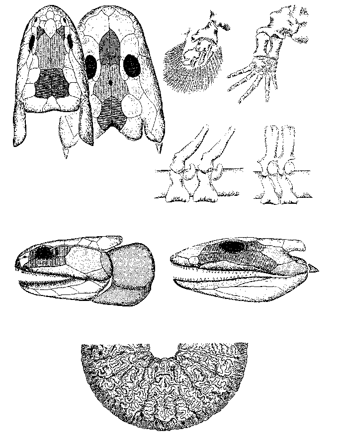 РИСУНОК 31. Преемственность анатомических структур (череп, конечности и позвонки) кистеперых рыб и амфибий: идентичные кости черепа имеют одинаковую заливку; идентичные кости обозначены одинаковыми буквами; отдельно — поперечный шлиф половинки зуба лабиритнтодонта.