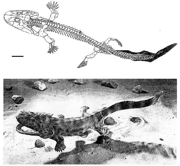 РИСУНОК 32. Архаичный лабиринтодонт Acanthostega: скелет (а) и реконструкция в естественной обстановке (б).