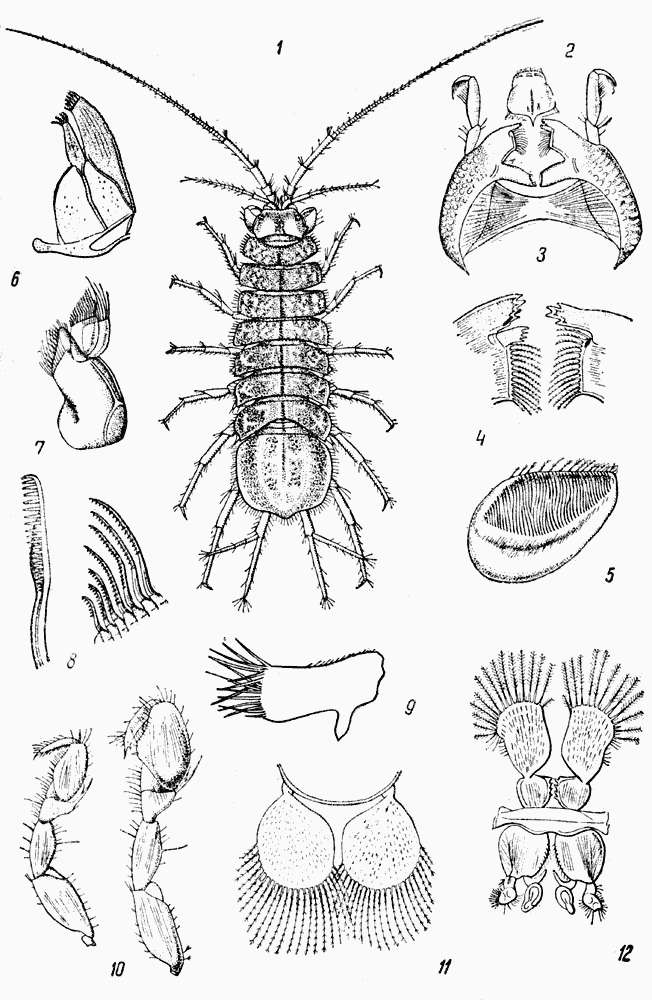 Таблица LXXII. Таблица LXXII. Водяной ослик - Asellus aquaticus: Рис. 1. Взрослый самец (За исключением рис. 9, все рисунки этой таблицы по Сарсу). - Рис. 2. Верхняя губа. - Рис. 3. Верхние челюсти. - Рас. 4. Дистальная часть верхних челюстей. - Рис. 5. Внутренняя поверхность перетирающего отростка верхних челюстей. - Рис. 6. Нижние челюсти (1-я пара). - Рис.7. Нижние челюсти (2-я пара). - Рис. 8. Щетинки нижних челюстей. - Рис. 9. Придаток ногочелюстей самки (по Янке). - Рис. 10. Грудные ноги первой пары с ложной клешней самки и самца (направо). - Рис. 11. Первые брюшные ножки самки. - Рис. 12. Первые и вторые брюшные ножки самца.
