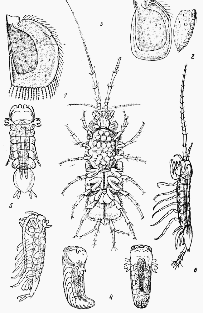 Таблица LXXIII. Водяной ослик - Asellus aquaticus: Рис. 1. Третья брюшная ножка (по Сарсу, как и прочие рисунки таблицы). - Рис. 2. Четвертая брюшная ножка. - Рис. 3. Самка с выводковой камерой. - Рис. 4. Эмбрион. - Рис. 5. Личинка 1-й стадии. - Рис. 6. Молодой водяной ослик перед выходом из выводковой камеры.