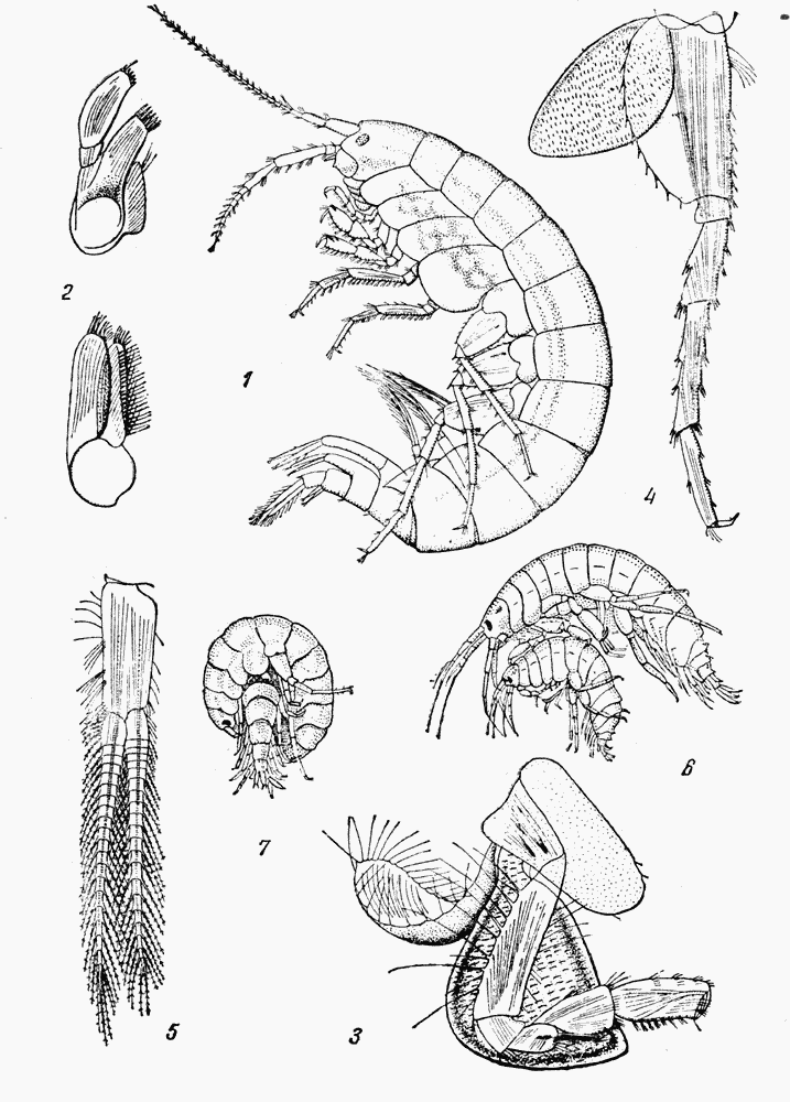 В озёрах, прудах и речках с относительно чистой водой живет обыкновенный бокоплав-блоха-рачек из отряда равноногих (Amphipoda) подкласса высших ракообразных (Malacostraca), из рода Gammarus, подрода Rivulogammarus (LXXIV, 1) (Новейшими исследованиями установлено, что под русским названием бокоплав-блоха объединяются несколько видов Gammarus (Rivulogammarus). Из наиболее широко распространенных видов, например, на севере Европейской части ССОР и в Сибири так называют Gammarus (Rivulogammarus) lacustris G. Sars; на Кавказе - Gammarus (Rivulogammarus) pulex L., в Средней Азии G. (R.) pulex L. и G. (R.) asiaticus Bir. (Mart). (Бирштейн)). Будучи пойман, этот рачек бьется у вас на ладони, лежа на боку и быстро крутясь. Тело его дуговидно изогнутое, сжатое с боков и сверху выпуклое; оно состоит из пяти головных, 8 грудных и 7 брюшных сегментов. Пять головных сегментов вместе с первым грудным слиты в небольшой цефалоторакс; семь грудных и шесть брюшных подвижно сочленены друг с другом, а последний брюшной сегмент представляет маленький расщепленный надвое тельсон. Самцы (15-20 мм) больше самок (10-15 мм).