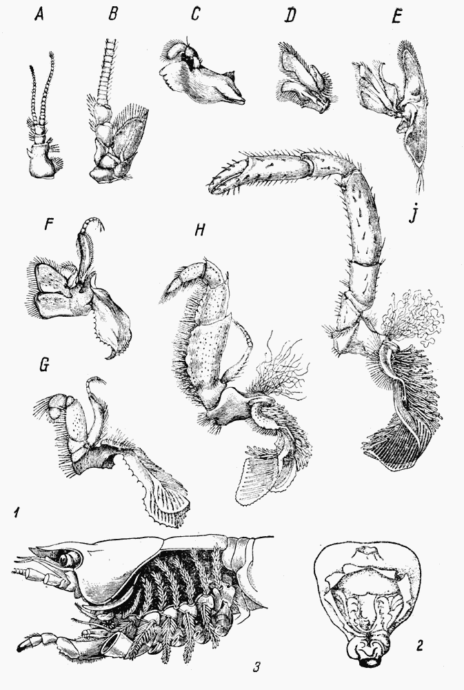 Основной членик ногочелюстей, клешни и первых трех пар ходильных ног несут жабры (LXXVI, 1); за исключением первой пары ногочелюстей жабры находятся и на сочленовной кожице у основания тех же конечностей, а также на стенках груди вблизи трёх последних пар ходильных ног; в зависимости от своего положения жабры являются ножными, сочленовными или плевральными. Ножные жабры имеют вид тонких пластинок и веточек, покрытых жаберными нитями; сочленовные и плевральные жабры - перистые. Вся система жабр помещается в жаберной полости, образованной боковой стенкой тела рака и боковой частью его панцыря (LXXVI, 3).