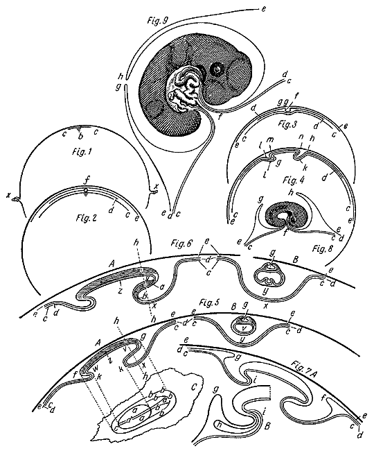 Общие соображения о значении процесса дробления яйца Бэр высказал в следующей форме: «Исходный индивидуум, яйцо, разделяется на бесчисленное количество индивидуальностей, каждая из которых имеет ничтожное значение и оказывается лишь элементарной составной частью нового индивидуума; жизненный процесс растворяет исходную индивидуальность, которая, однако, совсем не разрушается, так как из ее обломков возникает новый индивидуум»[108]. В этих словах содержится выражение того единства целостности и расчлененности многоклеточного организма, которое было понято значительно позднее, после окончательного торжества клеточной теории.