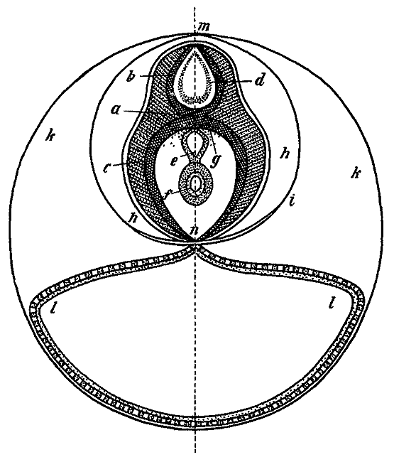 Идеальный вертикальный разрез через эмбрион позвоночного по Бэру. 1828.