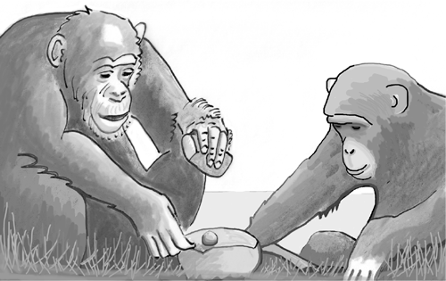 Раскалывание капуцинами орехов весьма расстроило приверженцев стройной сложившейся повести о людях и обезьянах. В этой истории мы не единственные существа, в прошлом которых был каменный век: наши ближайшие родичи даже продолжают в нем жить. Такую точку зрения подтверждают раскопки в тропических лесах в Кот-д'Ивуаре, где были обнаружены следы «ударной каменной технологии» (включая скопления камней и остатков расколотых орехов), которой шимпанзе пользовались на протяжении по меньшей мере четырех тысяч лет{111}. С этим открытием вырисовывается сюжет о культуре каменного века, общей для человекообразных обезьян и человека, весьма симпатично связывающей нас с нашими непосредственными родичами.