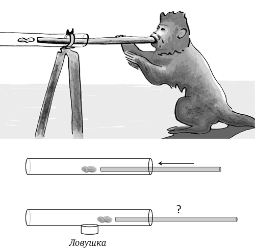 Как Роберте удалось решить проблему? Исследователи предположили, что методом проб и ошибок она выяснила, что палку надо вставлять в тот конец трубы, который дальше от ореха. Так орех можно было вытолкнуть, минуя ловушку. Это предположение было проверено несколькими способами, в одном из которых Роберте предложили трубу без всякой ловушки. Теперь, чтобы достать орех, она могла вставлять трубу с любой стороны. Тем не менее Роберта продолжала бегать от одного конца трубы к другому, оценивая расстояние до ореха, таким образом следуя выработанному правилу, принесшему ей успех. Поскольку Роберта действовала так, будто ловушка оставалась на месте, очевидно, что она не придавала значения устройству трубы. Визалберджи пришла к выводу, что капуцины способны решить подобную задачу, по существу не понимая ее{112}.
