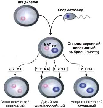 Техника ядерных пересадок использовала микропипетки и микроскопы с большим увеличением для удаления мужского или женского ядра из только что оплодотворенной яйцеклетки и введения их в разных комбинациях во вторую оплодотворенную яйцеклетку («хозяна»), которая уже была денуклеирована; тем самым создавались снова диплоидные эмбрионы с двумя материнскими (гиногенетические) или двумя отцовскими (андрогенетические) геномами или двуродительским геномом (дикий тип). Гиногенетические и андрогенетические эмбрионы были летальными на ранних эмбриональных стадиях. Лишь те реконструированные эмбрионы, которые получили и материнское, и отцовское ядро (дикий тип), выживали и давали живых мышат Эти эксперименты показывают, что при воспроизведении млекопитающих необходимы и материнский, и отцовский геномы и что эти два родительских генома экспрессируют разные наборы генов, нужных для полного эмбрионального развития
