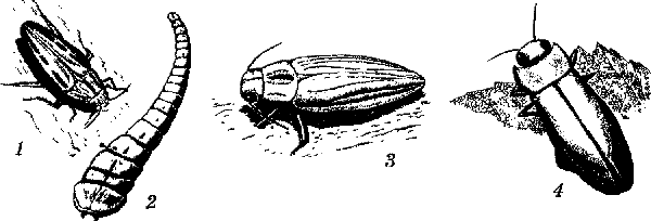 Златки: 1 — большая сосновая; 2 — ее личинка; 3 — халеофора; 4 — антаксия
