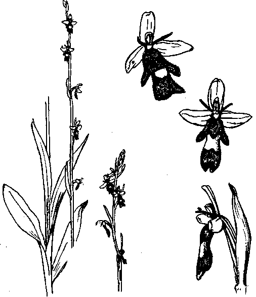 Рис. 79. Офрис насекомоносный (справа — отдельные цветки в различных ракурсах).