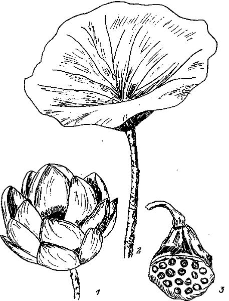 Рис. 82. Лотос орехоносный. 1 — цветок, 2 — лист, 3 — плод.