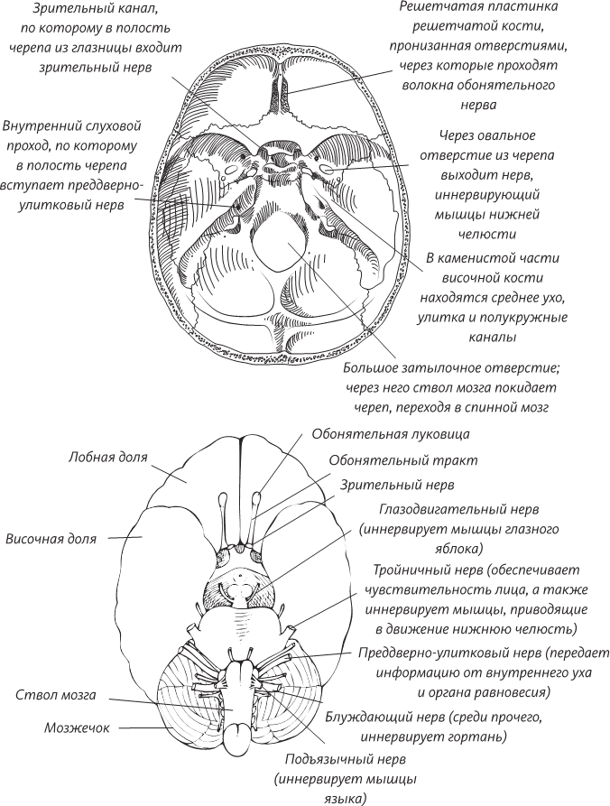 Вверху: Крышка черепа удалена. Видно основание черепа и прободающие решетчатую пластинку отверстия, через которые проходят нервные волокна и кровеносные сосуды. Внизу: Показана нижняя поверхность головного мозга, на которой отмечены места выхода из него черепных нервов